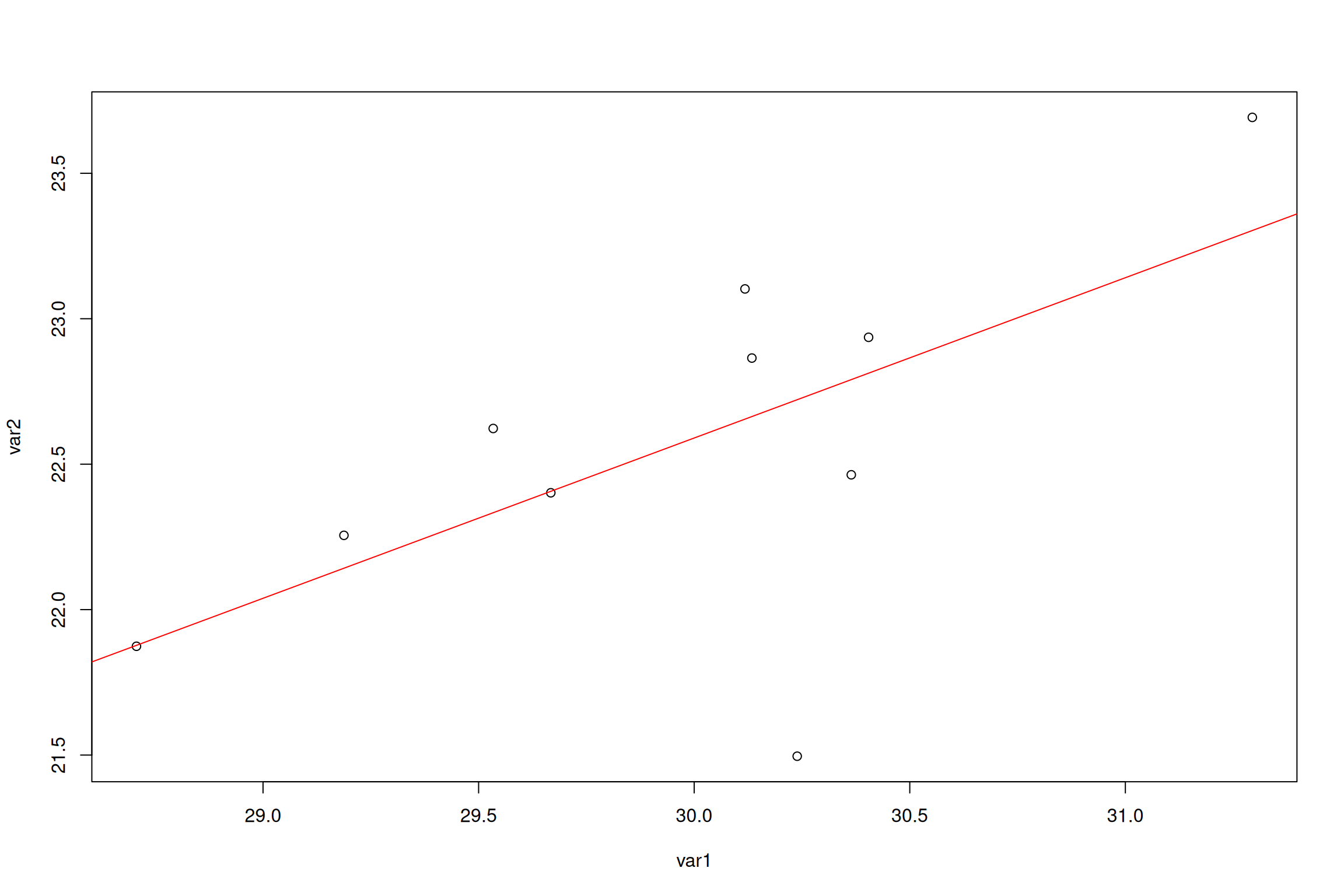 plot(var1,var2)abline(a=6.060,b=.551,col="red")