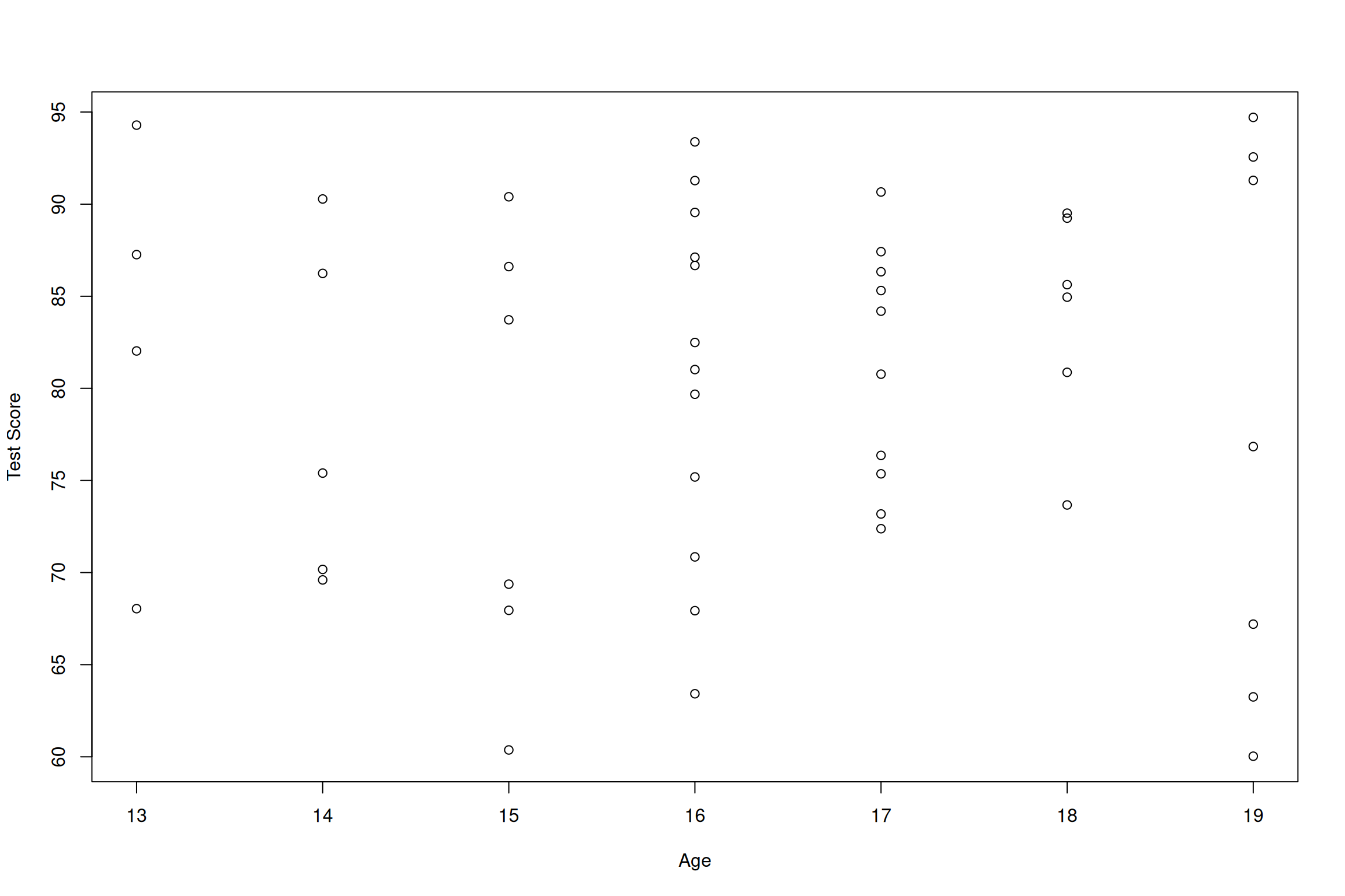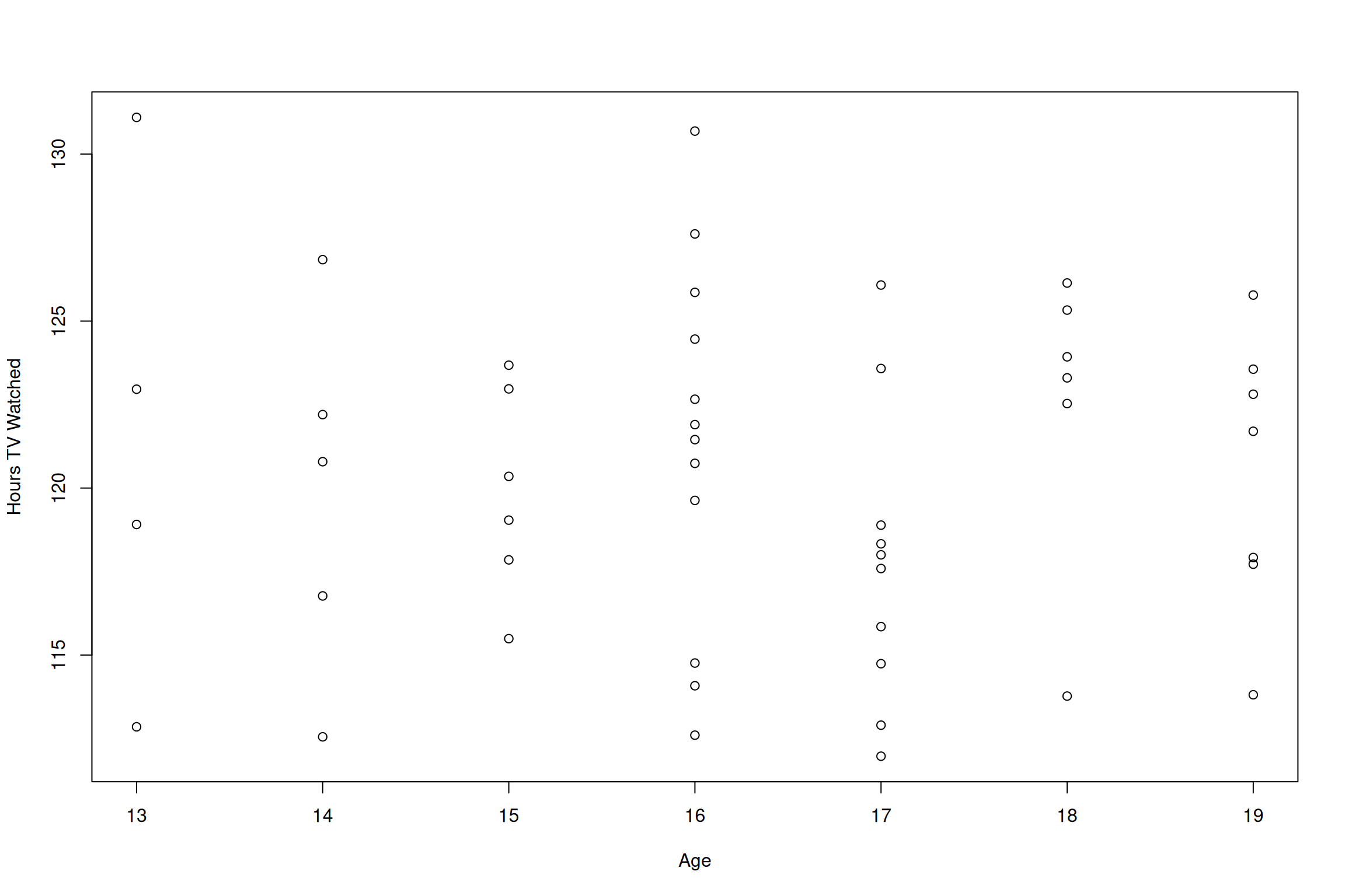 Age has a minimum of 14 and a maximum of 18.Hours Watched has a minumum of 5.05 and maximum of 7.10. Test Score has a minumum of 58.81 and a maximum of 78.98.