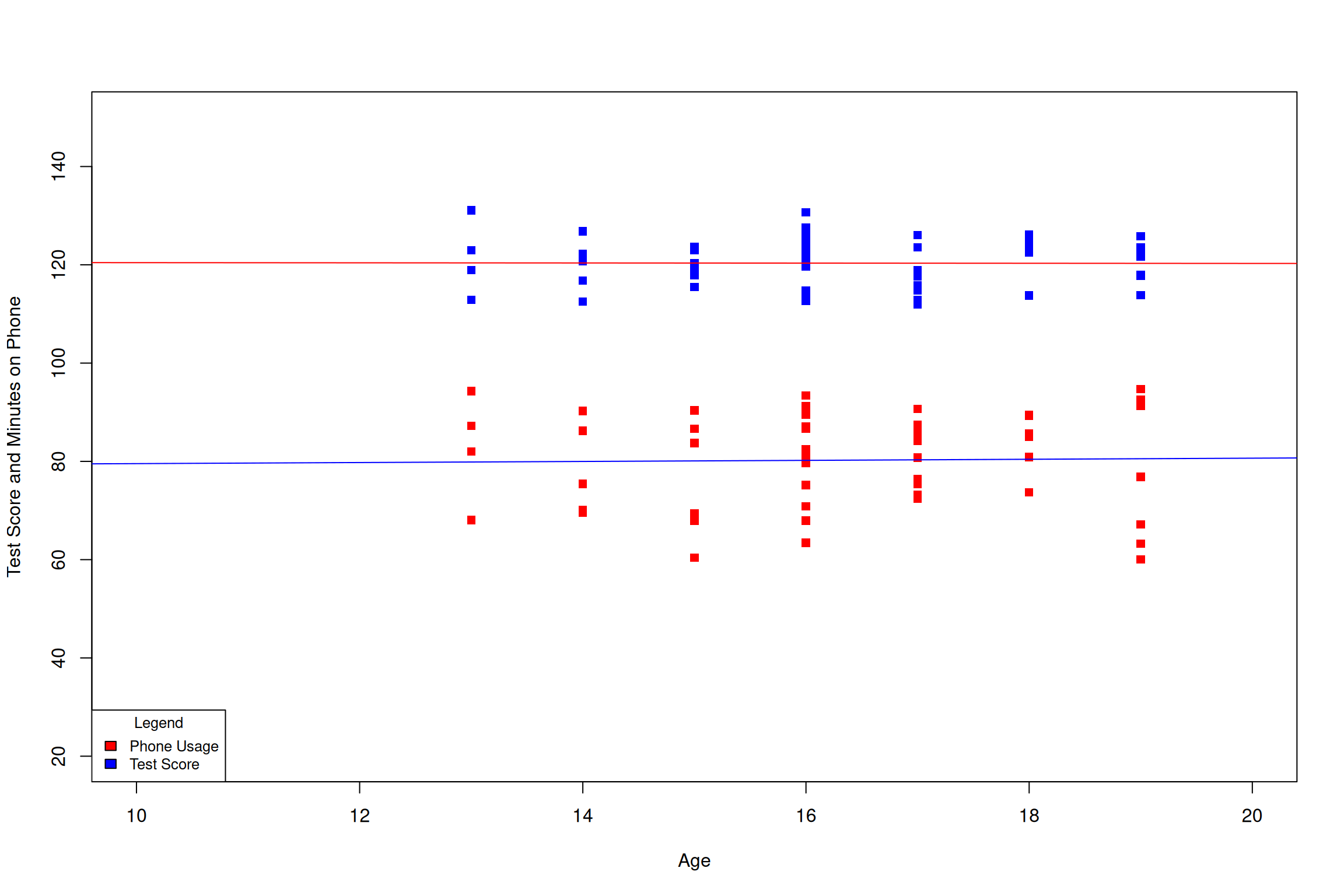 plot(Attention_Experiment$Test_Score~Attention_Experiment$Age,xlab="Age",ylab="Test Score and Minutes on Phone",xlim=c(10,20),ylim=c(20,150),col="red",pch=15)points(Attention_Experiment$Minutes_Phone~Attention_Experiment$Age,xlab="Age",ylab="Hours TV Watched",xlim=c(10,20),ylim=c(20,150),col="blue",pch=15)legend("bottomleft",title="Legend",c("Phone Usage","Test Score"),fill=c("red","blue"),cex = .8)abline(Test_Age.mod,col="blue")abline(Phone_Use.mod,col="red")